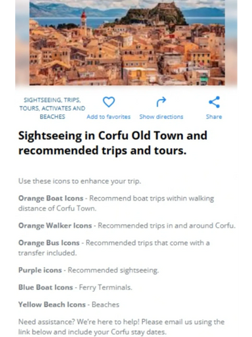 Google Maps can be unreliable in Corfu Town without precise guidance. Once you’re in Corfu, our Corfu Town Planner app serves as your offline companion, using GPS to help you find accommodation in Corfu Town and explore key Corfu Town attractions. It offers detailed walking routes, public transport options to beaches like Garitsa Bay and Royal Baths, and walking distances to popular destinations like Kanoni, Mon Repos, and the Old Town, ensuring easy navigation throughout Corfu Town. Of course, we want you to lose yourself in the narrow back streets, as that is half the fun.